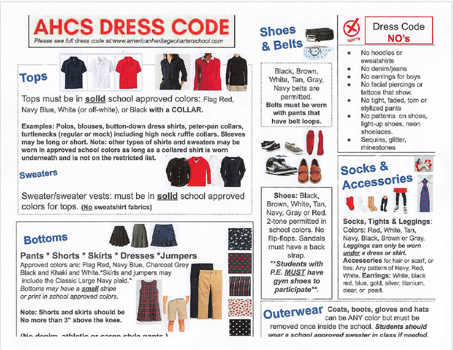 AHCS’s Uniform Code of Dress is outlined below, and may be changed by the Principal with approval from the Board at any time. Failure or refusal to abide by the Dress Code may result in progressive student discipline, up to and including suspension, expulsion, and/or disenrollment.